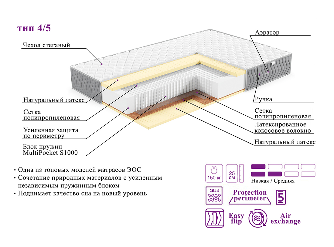 Матрас EOS Элит 4/5 – это уникальное сочетание природных материалов с усиленным независимым пружинным блоком.