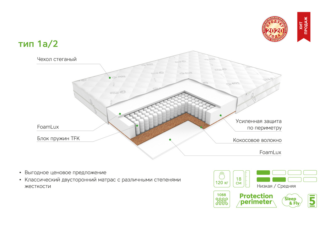 Матраса EOS Идеал 1а/2 – классический двусторонний матрас с различными степенями жесткости.