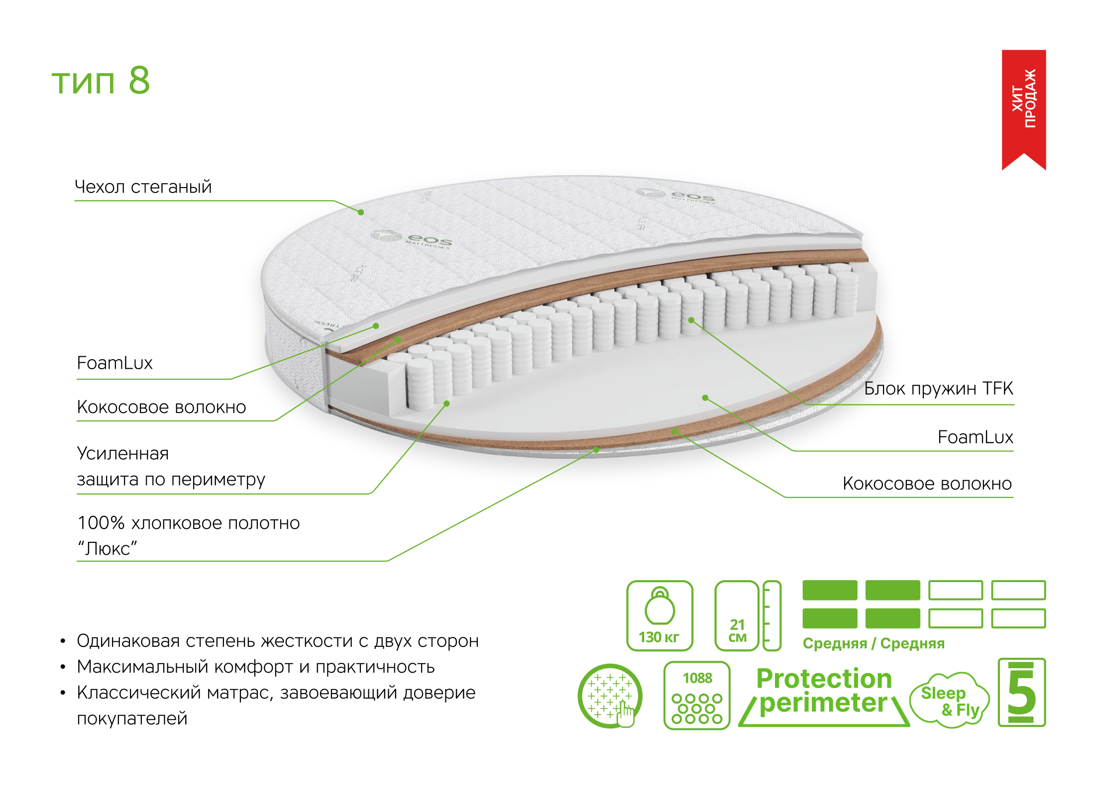 Матрас EOS Идеал 8 классический матрас с одинаковой степенью жесткости с двух сторон создающий максимальный комфорт и практичность.