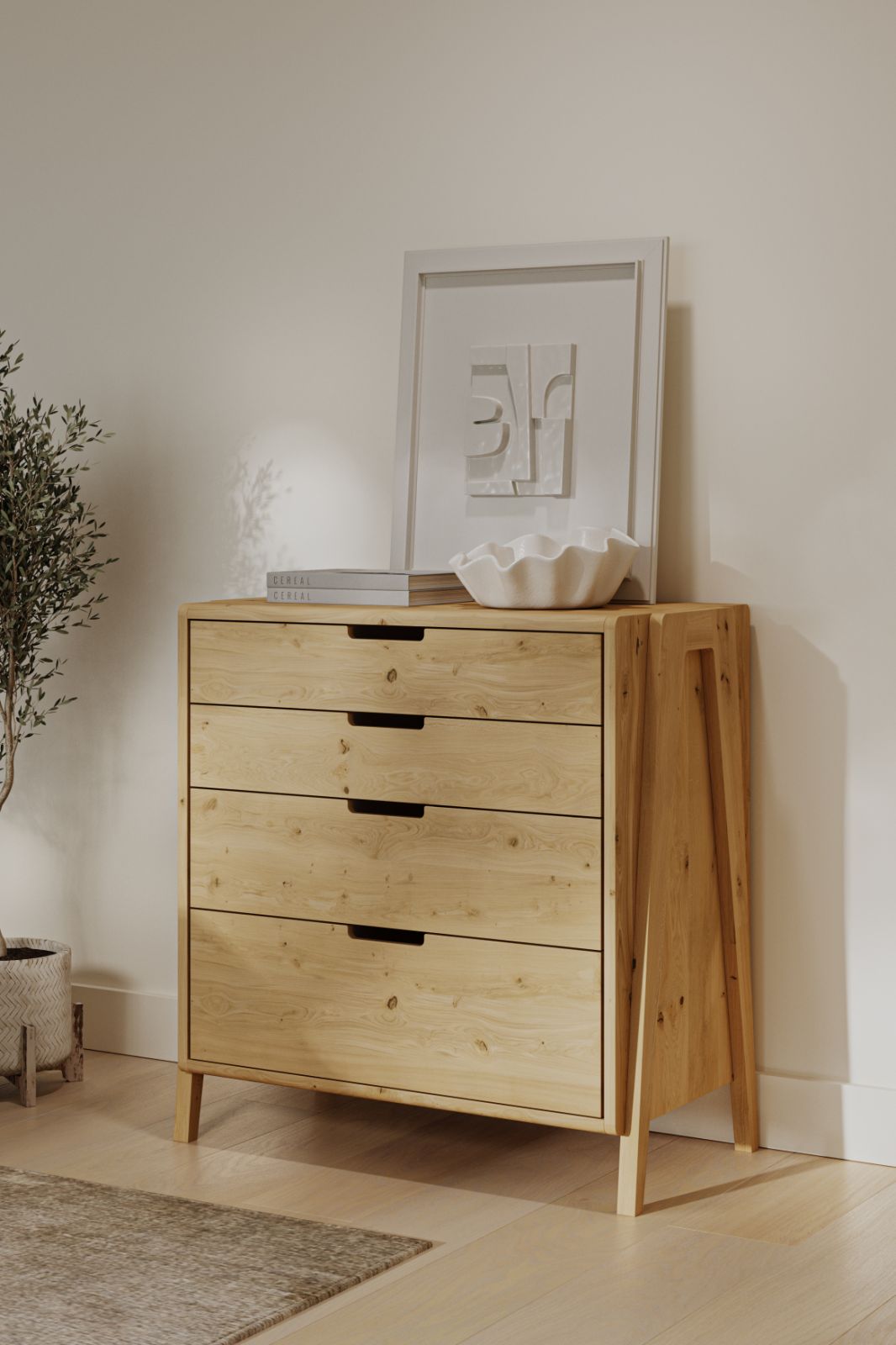 Комод Тенерифе изготовлен из массива дуба, что придает ему прочность и естественную красоту. Его дизайн отличается современным стилем с элегантной отделкой. Внутри комода расположены четыре удобных ящика разного размера, обеспечивающих практичное хранение различных предметов. Каждая выдвижная полка легко открывается и закрывается благодаря качественным механизмам, а их разнообразные размеры позволяют удобно организовать вещи — от мелких аксессуаров до более объемных предметов. Этот комод — стильное и функциональное дополнение любой комнаты, подчеркивающий природную теплоту и текстуру дуба.