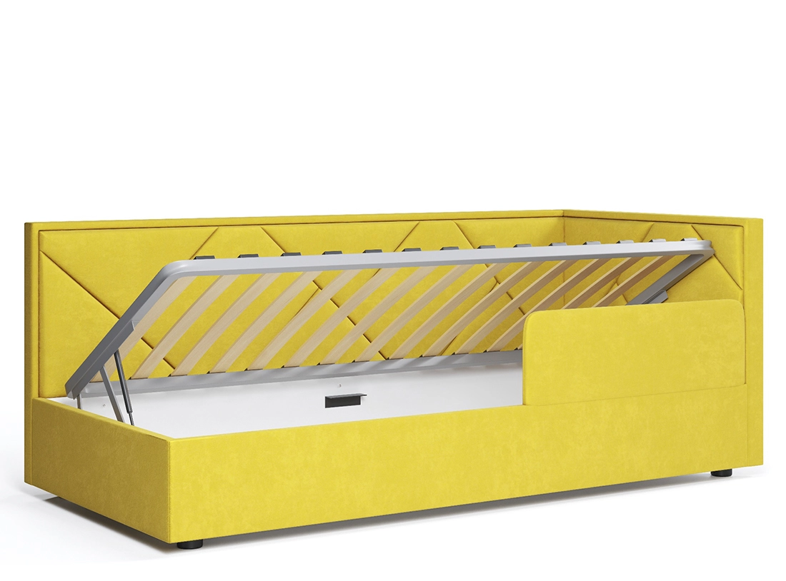 Кровать «Dana» от интернет-магазина ЭОС, производится со встроенным основанием с ортопедическими ламелями. Модель в мягкой обивке оборудована наборными бортиками с диагонально идущими фактурными линиями. Для постельного белья предусмотрена ниша.