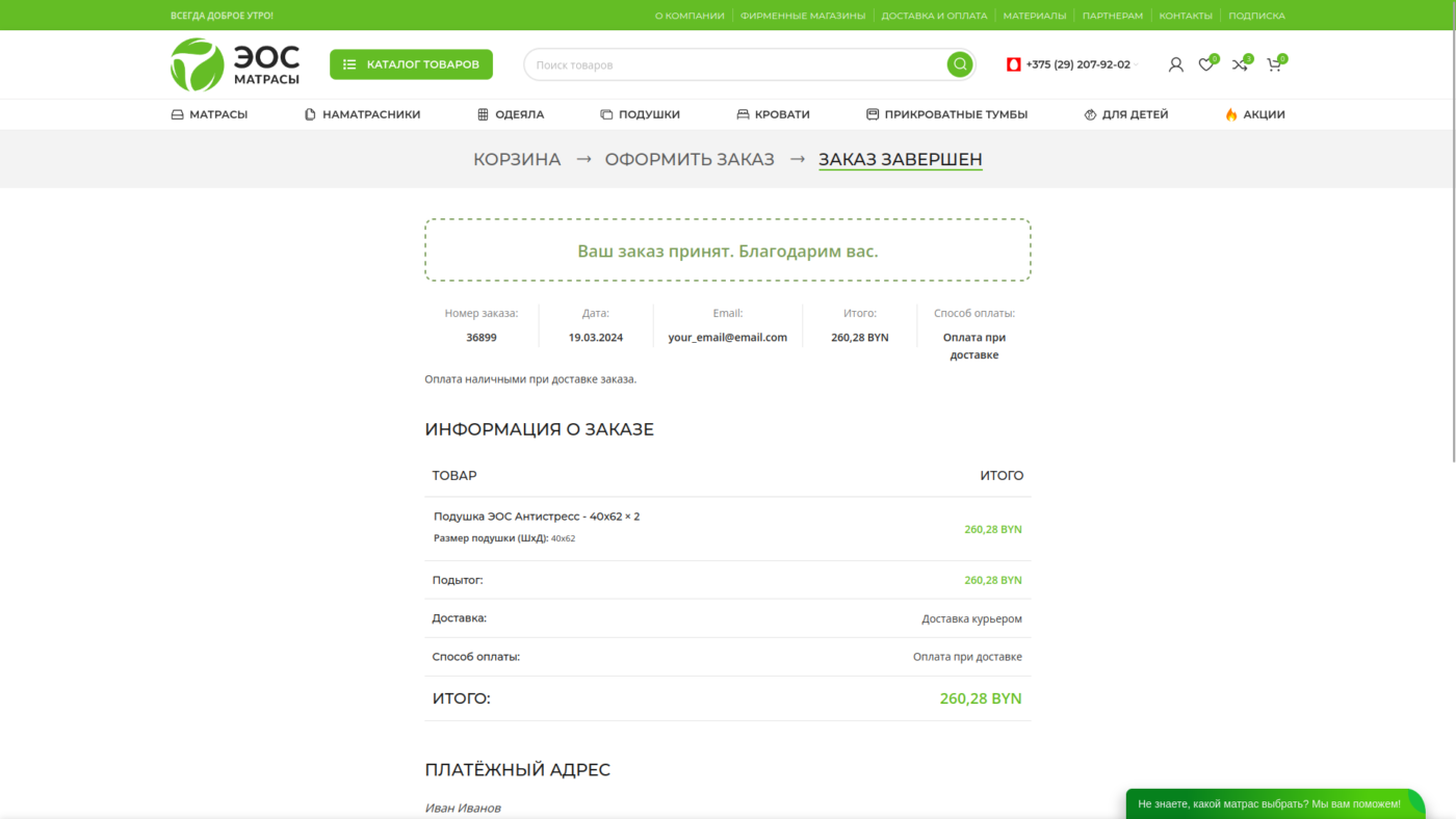 Если всё заполнено правильно, Вы будете перенаправлену на страницу подтверждения заказа.