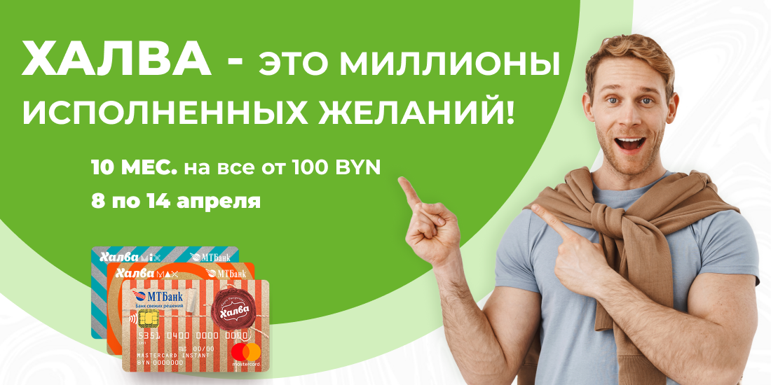 Только с 8 по 14 апреля оплачивайте заказы на сумму от 100 BYN картой “Халва”, и получайте целых 10 месяцев рассрочки!